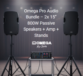 Omega Pro Audio Bundle – 2x 15″ 800W Speakers + USB/SD Amplifier + Stands