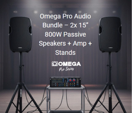 Omega Pro Audio Bundle – 2x 15″ 800W Speakers + USB/SD Amplifier + Stands