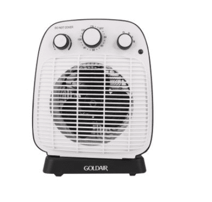 Compact Goldair 2000W fan heater with 3 heat settings, adjustable thermostat, cool-touch body, and essential safety features.