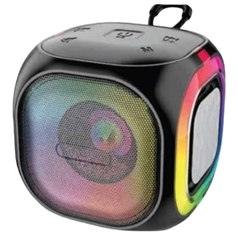 Compact 10W Bluetooth speaker with RGB lights, mic function, and versatile playback via USB, AUX, and TF.