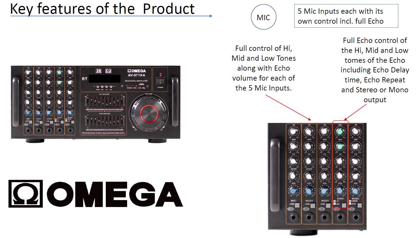 Buy the Omega AV-971KA Amplifier & High Power Speaker Bundle with Heavy Duty Stands. 80W RMS per channel, 2CH stereo, 3D surround, 5 mic inputs with echo, USB/SD/AV support. Perfect for karaoke, events, and parties.