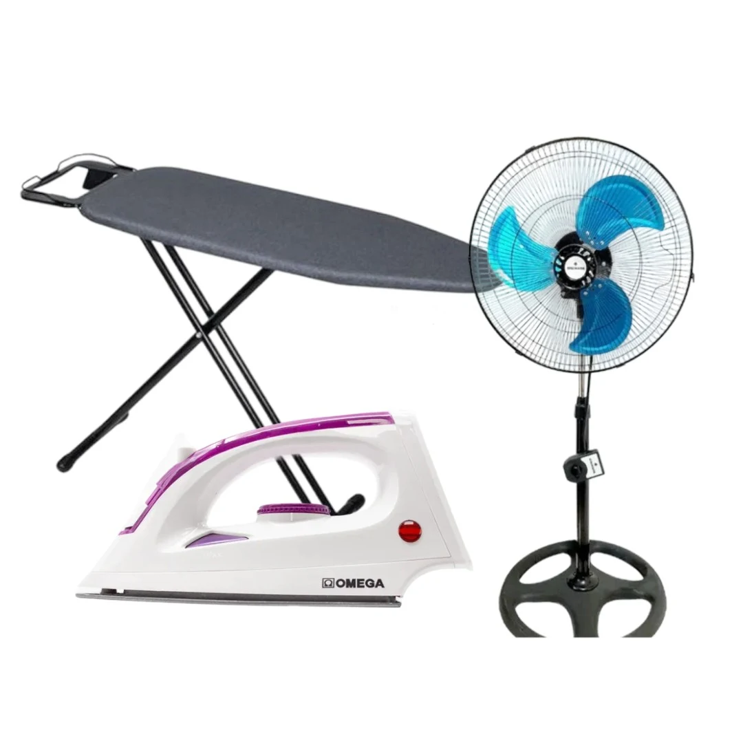 A practical household bundle including a pedestal fan, ironing board, and dry steam iron for everyday home use.