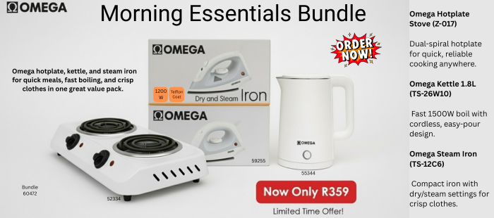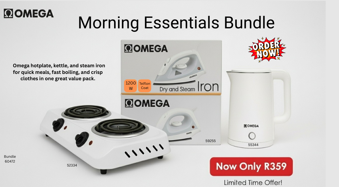 Whether you’re setting up your first home, looking for a student starter pack, or need reliable backup appliances, the Omega Morning Essentials Bundle offers unbeatable value, efficiency, and performance.