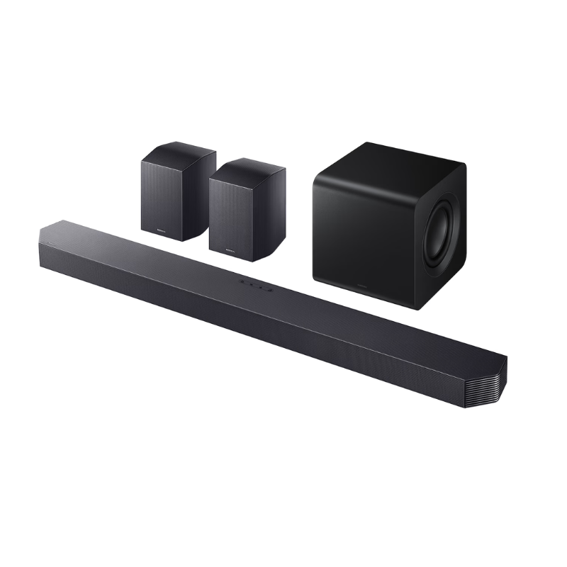 Samsung Q-Series Soundbar 9.1.4 CH – immersive surround sound with rear speaker for cinematic clarity.