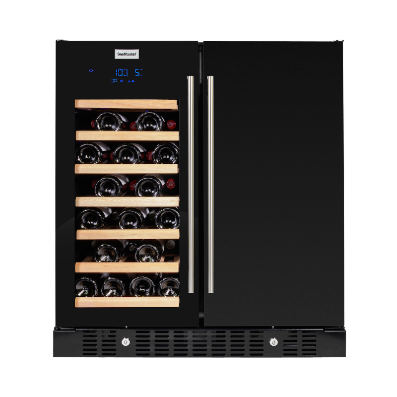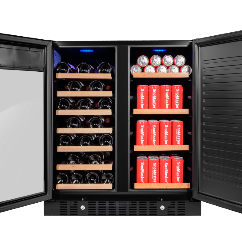 SnoMaster VT-19DPRO(BLACK): Premium double-door cooler with 34-bottle wine and 95L beverage storage, dual-zone cooling, and sleek black finish.