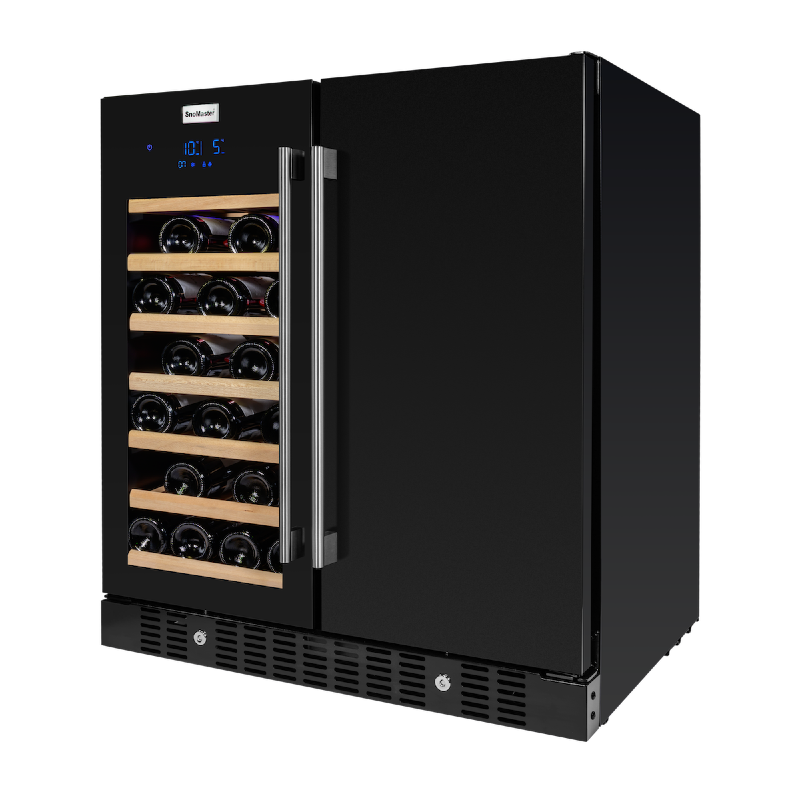 Sleek Black Finish: Glossy black glass on the wine side and matte black steel on the beverage side